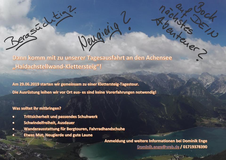 Am 29.06.2019 starten wir früh morgens in Richtung Rofangebirge an den tollen Achensee. Wir fahren mit den privaten Autos und leihen für ca. 15-20€ die Klettersteigsets aus. Mit der Rofanbahn fahren wir hoch auf etwa 1800müNN. Von dort aus laufen wir zur Rotspitz über den Grat zum Dalfalzer Joch bis zur 2299m hohen Hochiss. Nachdem wir den Gipfel des Roßkopfs gestreift haben, steigen wir in den für Anfänger geeigneten Klettersteig der Haidachstellwand ein. Nach insgesamt 10km und 700hm steigen wir wieder in die Rofanbahn ein und brechen den Heimweg an.